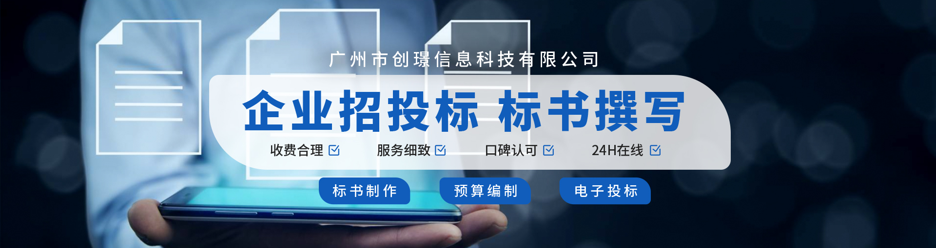廣州市創(chuàng)璟信息科技有限公司重點(diǎn)業(yè)務(wù)范圍覆蓋招投標(biāo)行業(yè)所需服務(wù):招投標(biāo)文件撰寫(xiě)制作、企業(yè)資質(zhì)申報(bào)辦理、招投標(biāo)投標(biāo)代辦服務(wù)、企業(yè)人才提升培訓(xùn)等業(yè)務(wù),我司望打造成為全國(guó)領(lǐng)先的投標(biāo)咨詢(xún)服務(wù)企業(yè)。